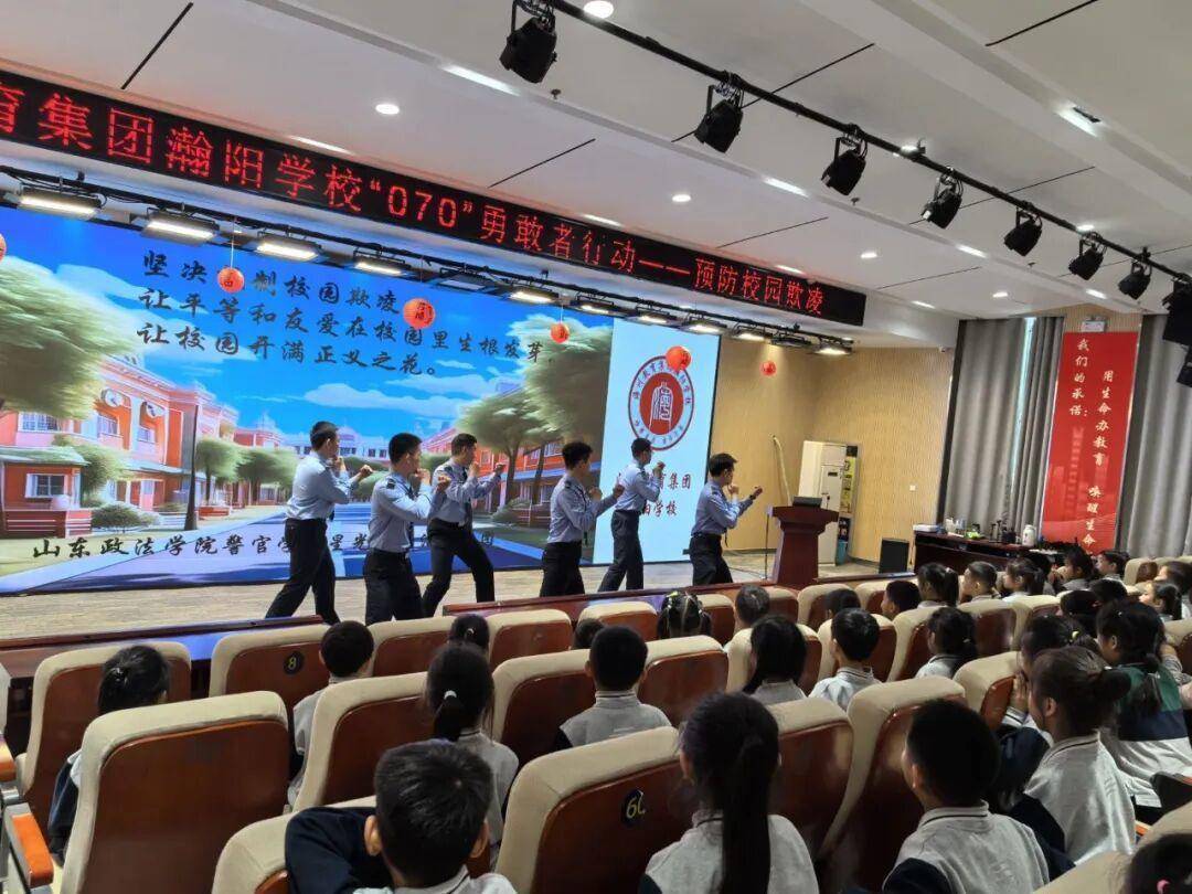 活动中,山东政法学院大学生法治辅导员走进瀚阳学校,开展防欺凌专题讲座。讲座打破传统模式,融合主题宣讲、情景话剧、防身术教学、警械展示等形式,让学生在情景体验中认清校园欺凌危害,在互动中掌握自我保护技能。大学生们还进行警体拳展演,动作整齐、口号铿锵,赢得师生阵阵掌声。现场互动频繁,学生认真聆听、积极提问,进一步树立起知法懂法守法、依法维权的法治意识。