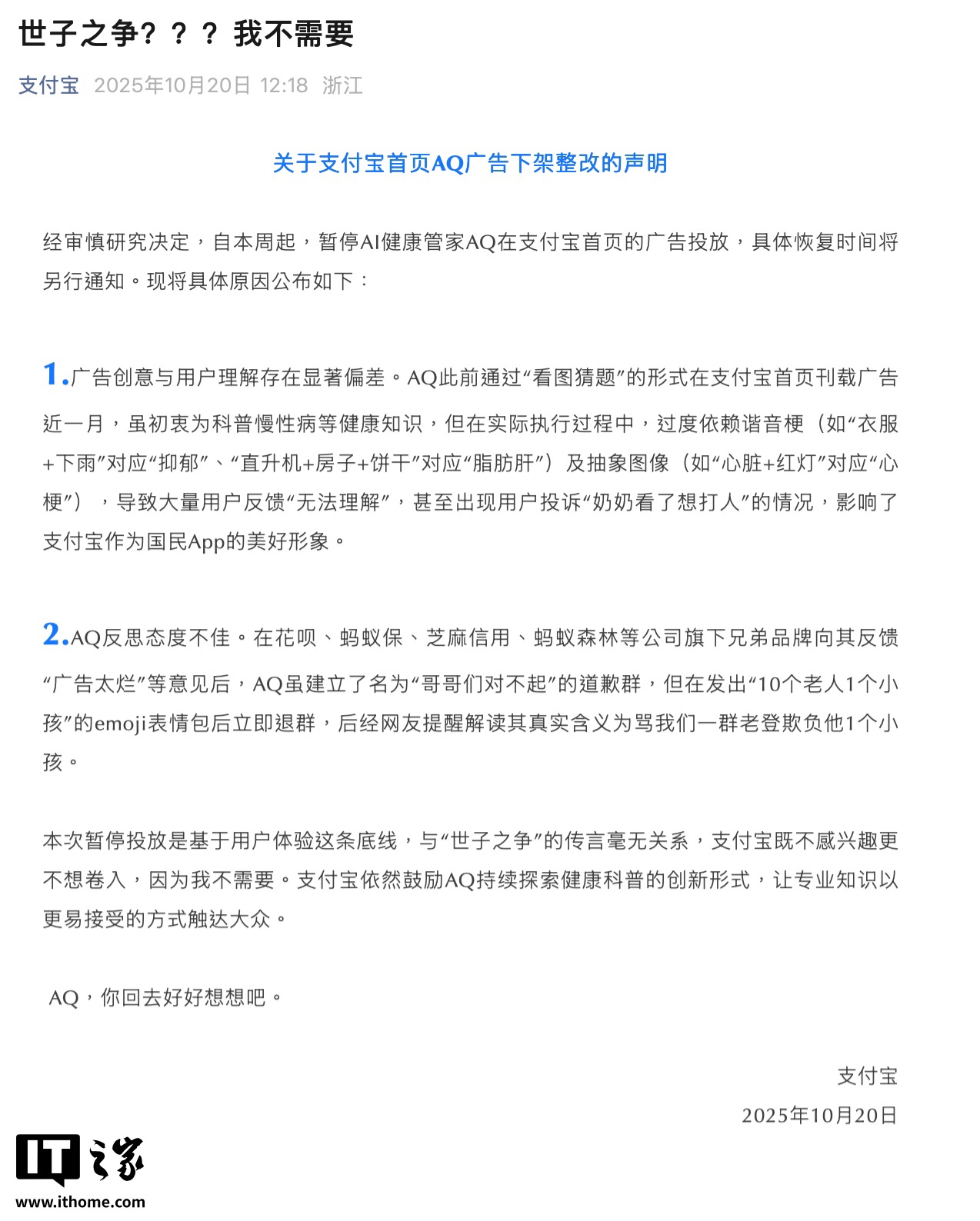 IT之家注意到,目前支付宝官方公众号发文,宣布自本周起暂停 AI 健康管家 AQ 在支付宝首页的广告投放,具体恢复时间将另行通知。